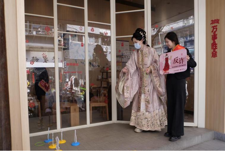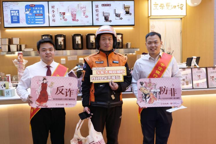 在老门东剪子巷店,古色古香的街区与活动现场相得益彰。来自私人银行部的员工正在为游客讲解防范非法集资要点。外地游客陈先生举着刚获得的帆布包拍照留念:“我是来南京旅游的,没想到买杯奶茶还能遇上这么特别的活动。这个包设计得很雅致,上面的‘反诈’大字一点都不突兀,反而很有个性。我准备背着它逛夫子庙,既是纪念品,也是随身提醒。”