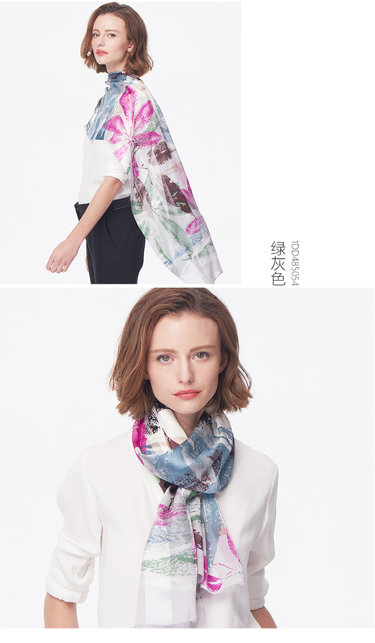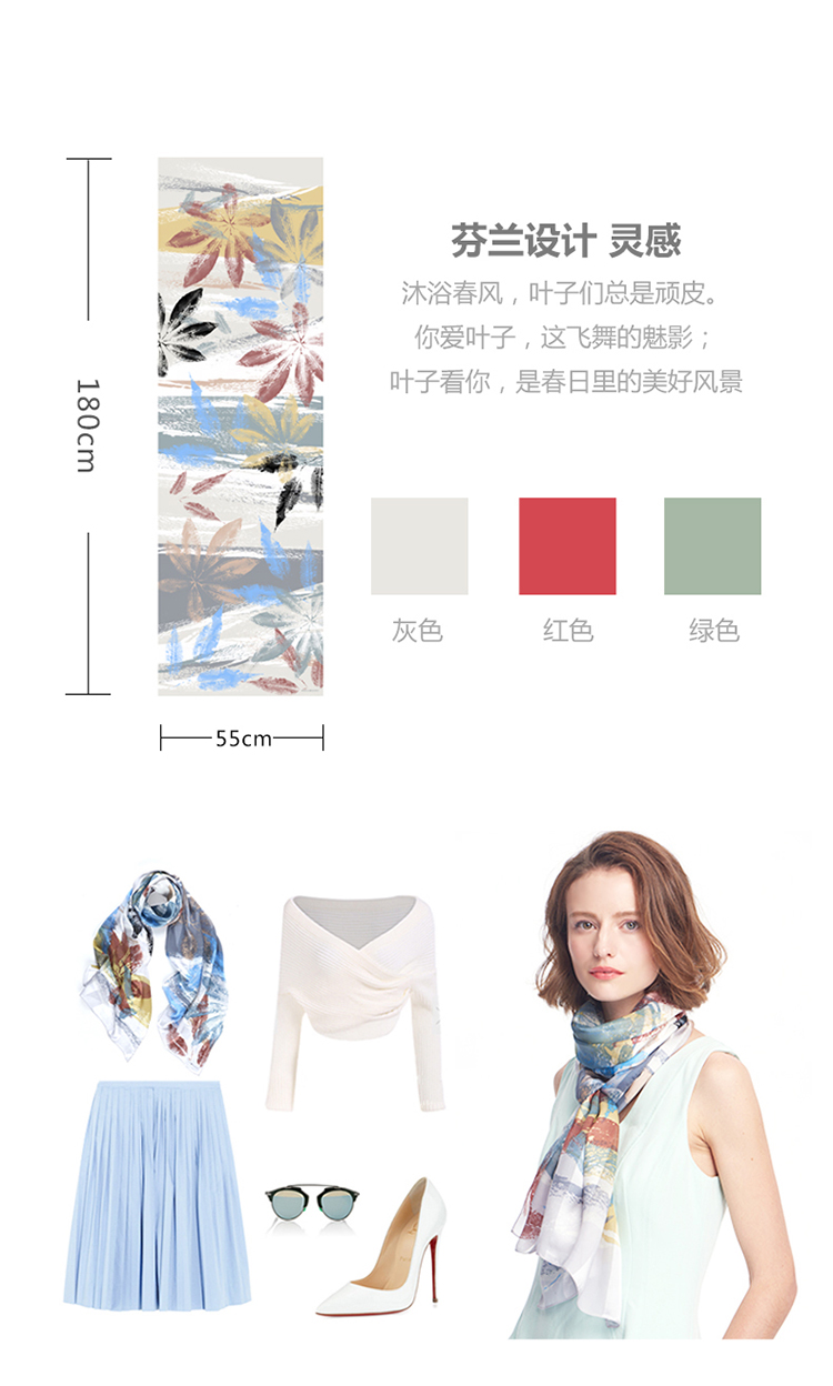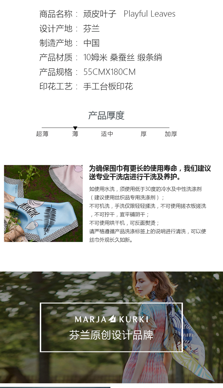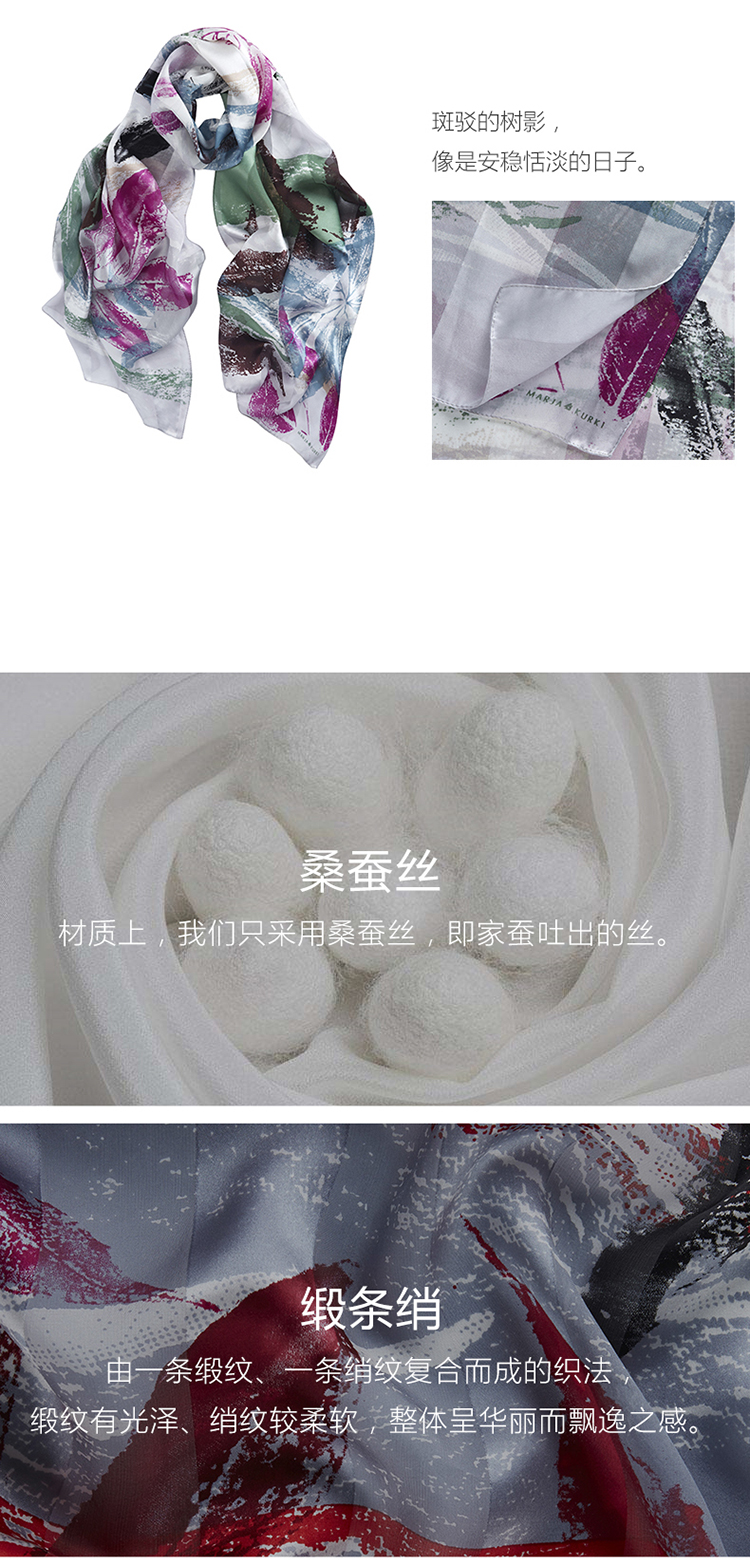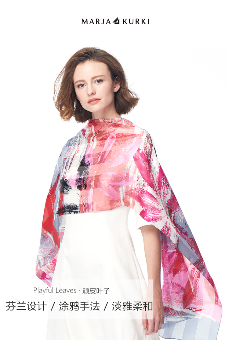 MarjaKurki玛丽亚.古琦 真丝丝巾 女士长丝巾桑蚕丝“顽皮叶子”灰色