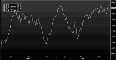 附:2009年9月29日-2010年3月29日联系标的(西德克萨斯州轻质原油近月交割的期货合约(WTI Light Sweet Crude Oil Front Futures),彭博代码 “CL1 Cmdty”)走势图