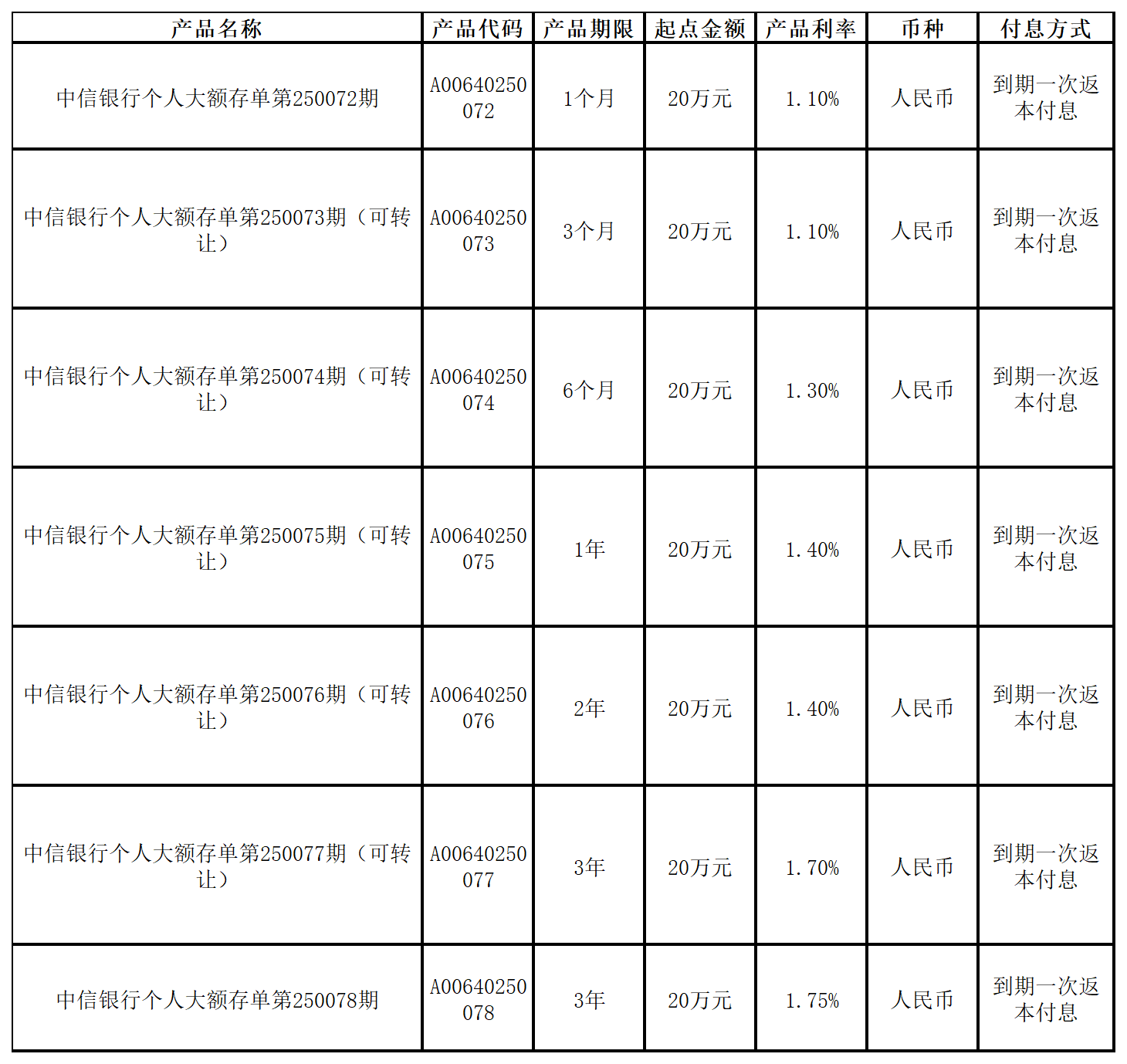 中信银行将于2025年10月1日起发行个人大额存单第250072-250078期产品,产品要素如下:
