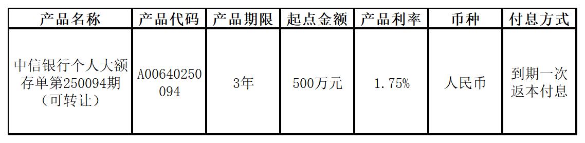中信银行将于2025年12月29日起发行个人大额存单第250094期产品,产品要素如下: