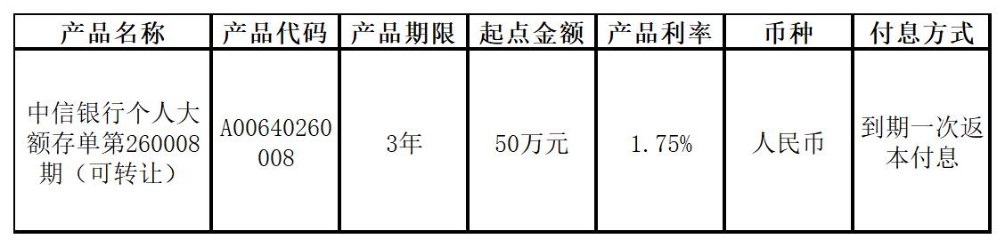 中信银行将于2026年1月8日起发行个人大额存单第260008期产品,产品要素如下: