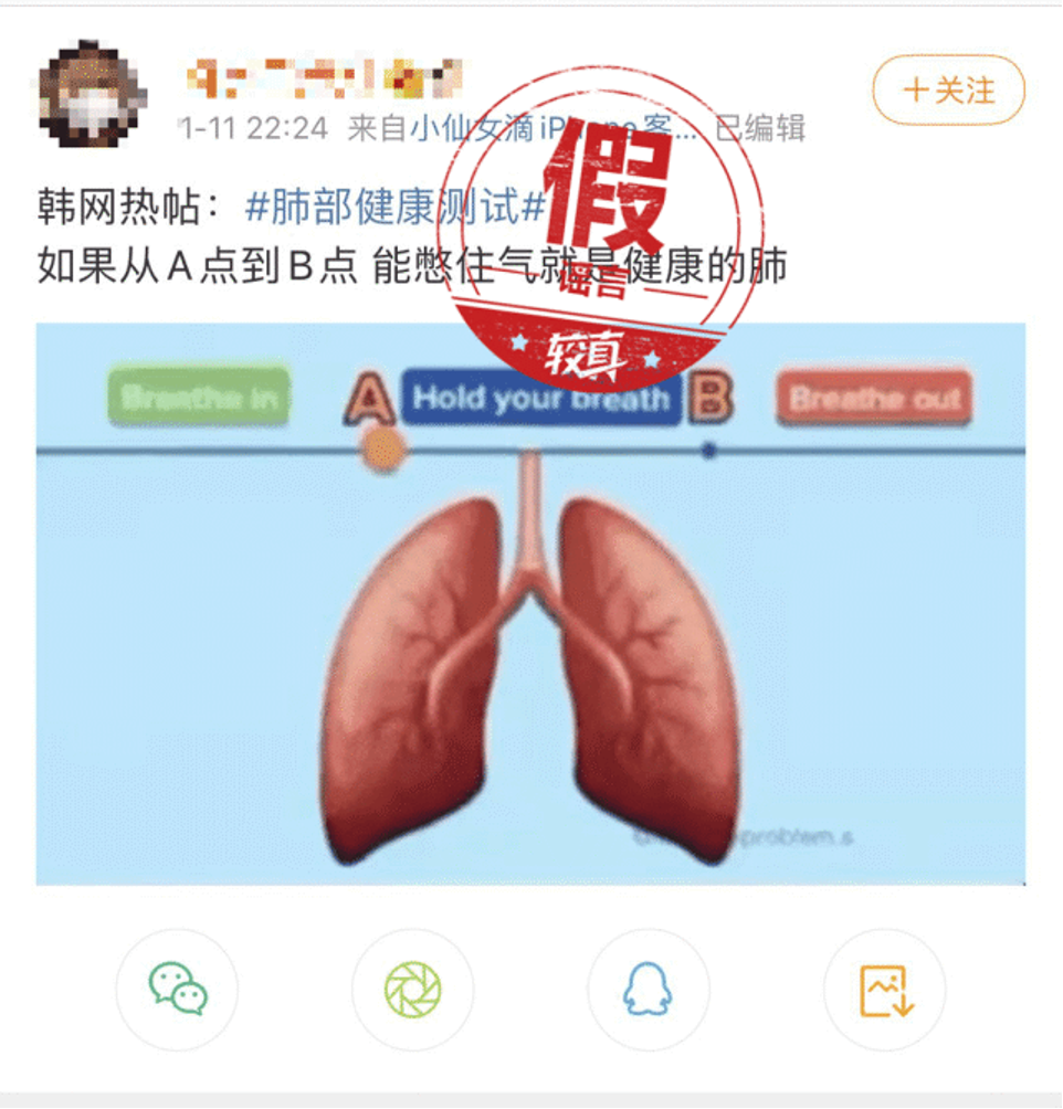 最近,社交媒体流传一个“肺部健康测试”的动图,图中有吸气和吐气两个指引,中间让大家憋气一段时间,不同版本的测试要求的憋气时间不同,有的是30秒,有的是50秒。这个方法真的能测试肺部健康吗?