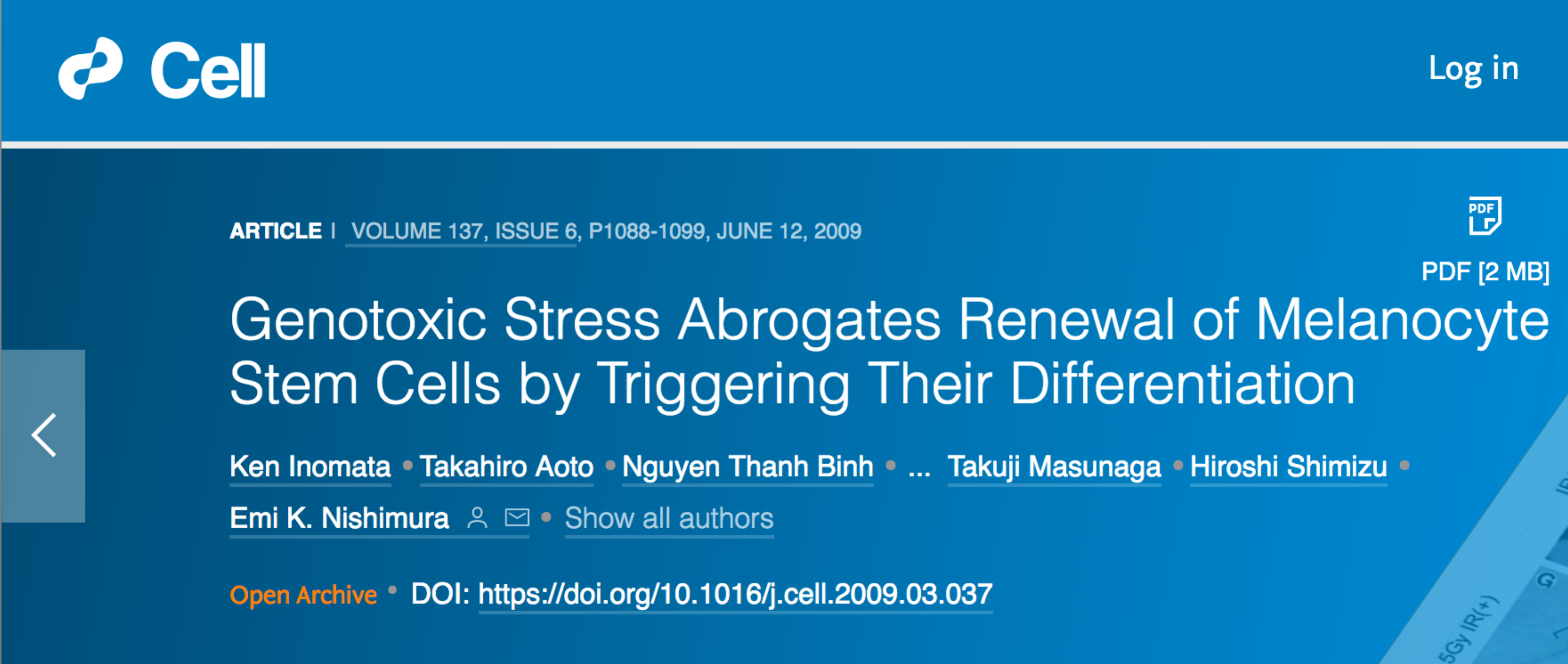 图注:日本研究团队在《细胞》杂志上发表的论文,标题为《基因毒性压力触发黑色素干细胞转变成(黑色素细胞)而阻止其继续更新》,时间为2009年6月12日