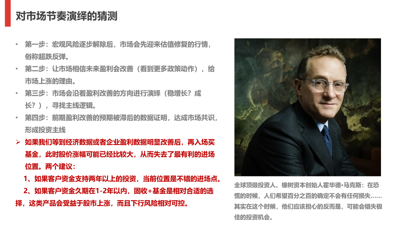 如果把投资周期放在2-3年,目前仍然是底部区域。当然,底部形成的过程往往复杂和曲折,存在分歧和反复也是正常的。在5月周例会上,我跟大家推演过市场行情演绎四个阶段: