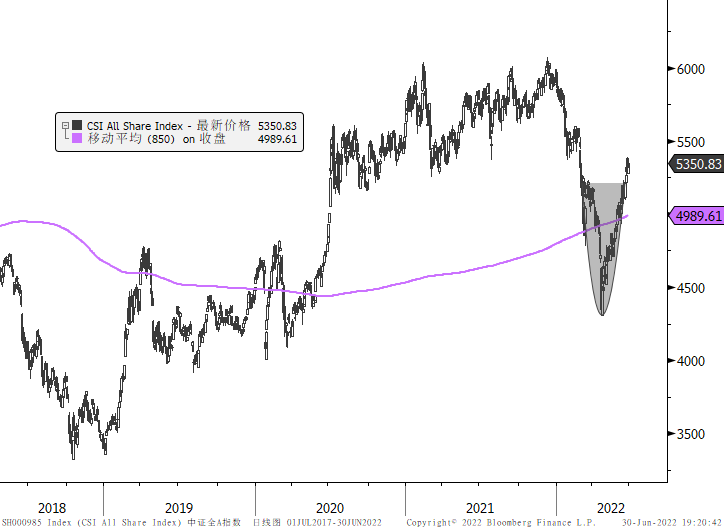 深圳疫情和上海疫情导致的非理性抛售,随着疫情不再是困扰市场的问题时,这种冲击不会永久停留在估值体系中,换句话说,市场对此的认识是,这是一次性冲击,并不会成为常态。所以,如果我们把这段K线从图上隐去后,就能明白为什么市场涨到现在还在涨了。到目前为止,我们认为市场的上涨都是合理的。